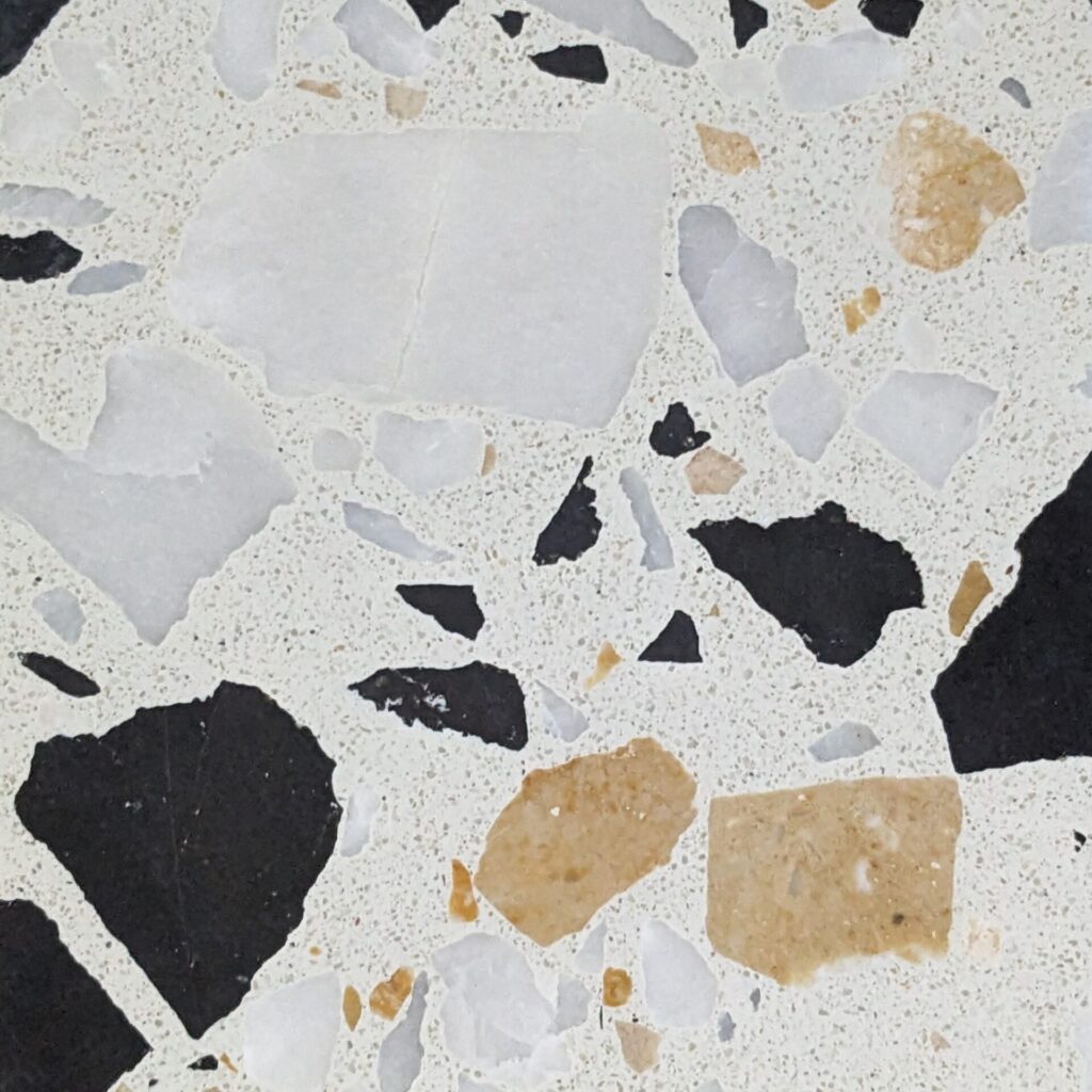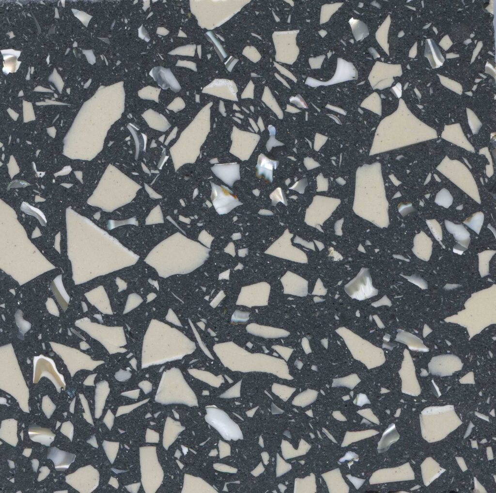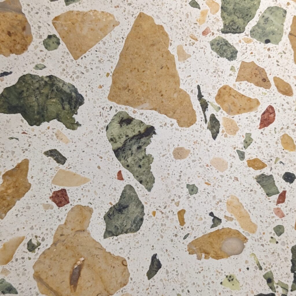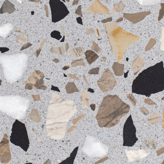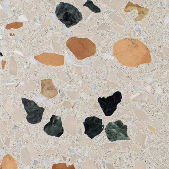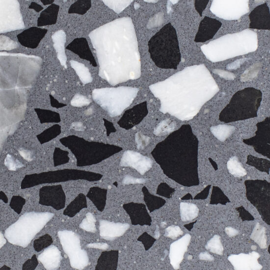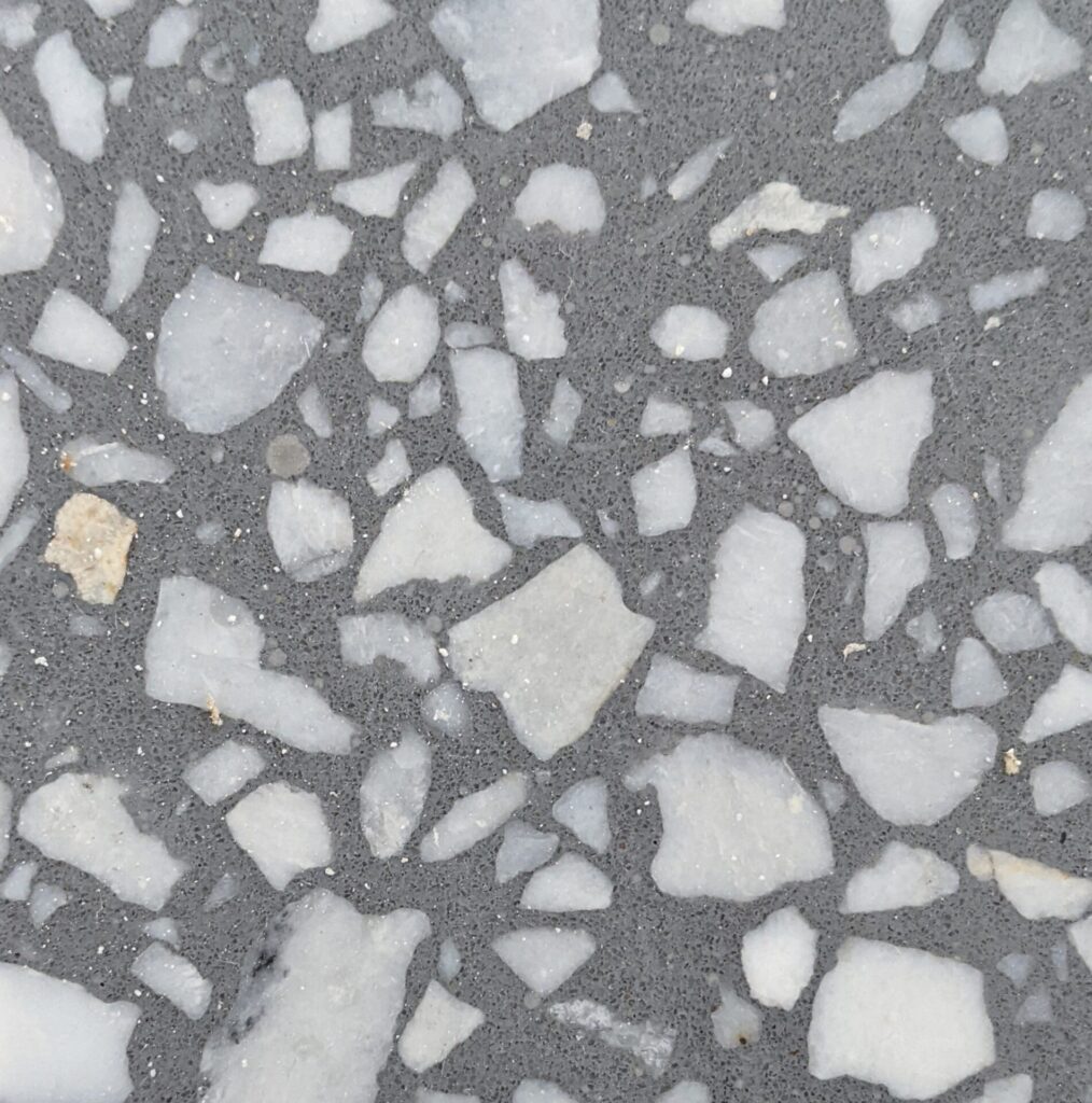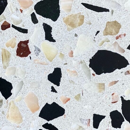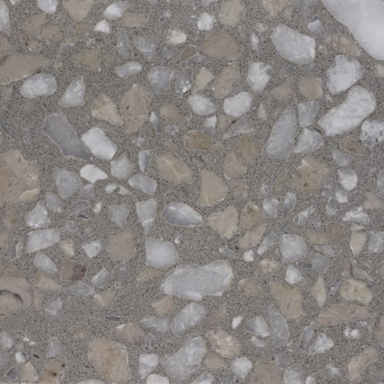 DEX Venizia is a concrete based terrazzo made in the flavor of traditional Venetian terrazzo. Its chunky look is the result of marble aggregate chips averaging ¾” to 1” and even up to 1 ½” in some finishes. Venizia is honed to a satin sheen and then sealed with a durable clear coat for superior protection.
