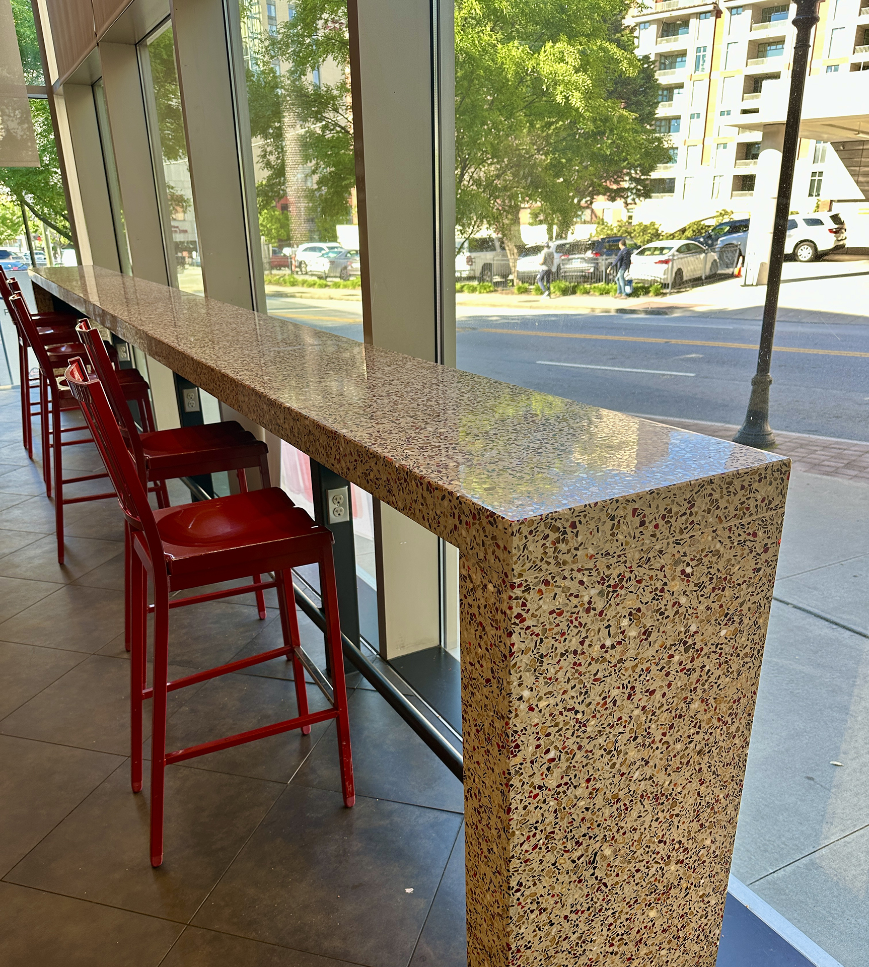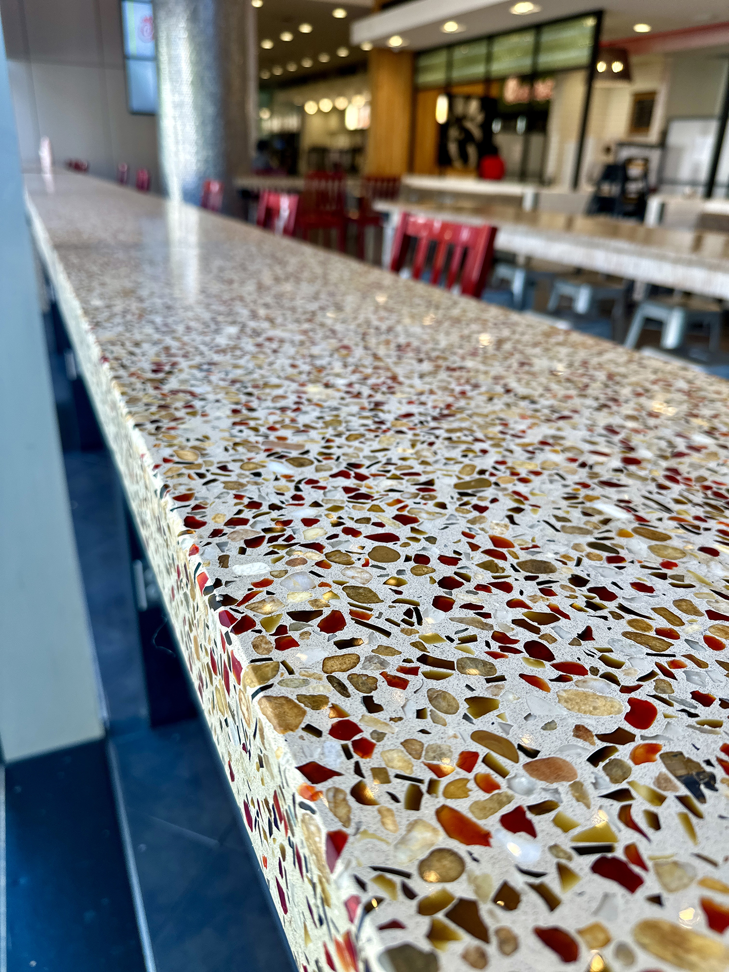 Across the U.S., DEX has provided high-performance concrete and terrazzo elements for Chick-fil-A locations—ranging from countertops to freestanding community tables with integrated legs. Designed for durability, longevity, and low maintenance, these pieces not only withstand the demands of high-traffic dining environments but also elevate the customer experience with refined finishes and thoughtful detailing.