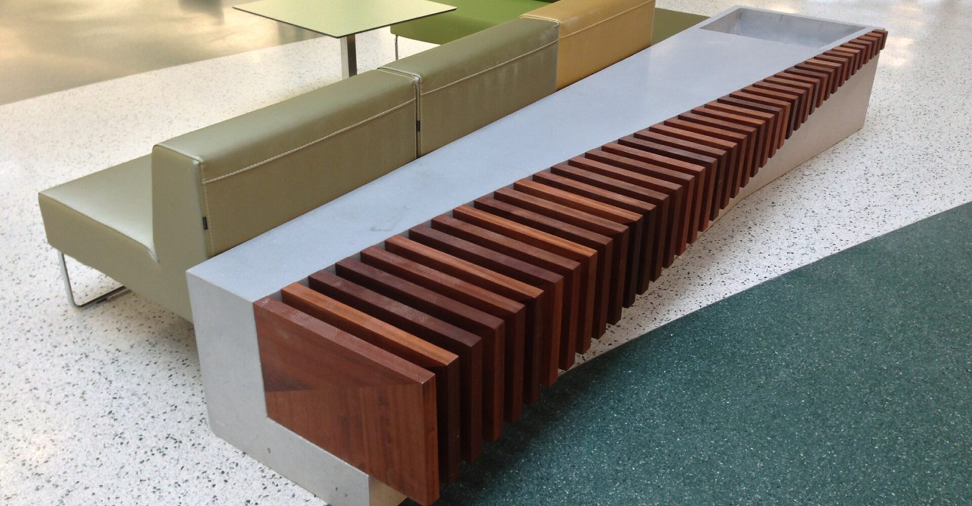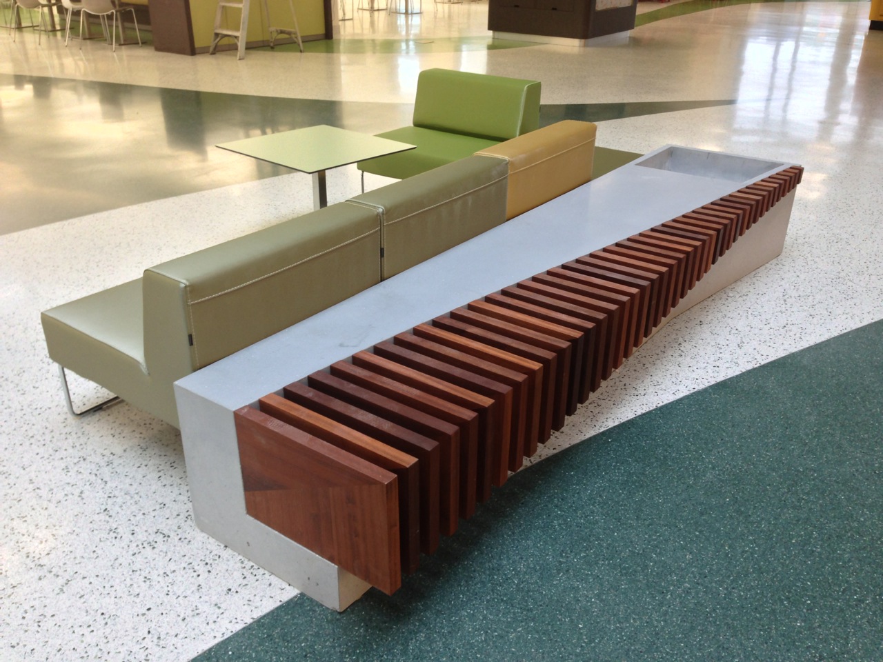 To enhance comfort and add warmth, ipe wood slats were integrated into the seating surfaces. The pairing of natural wood and clean-lined concrete provides a timeless balance of texture, durability, and ease of maintenance.