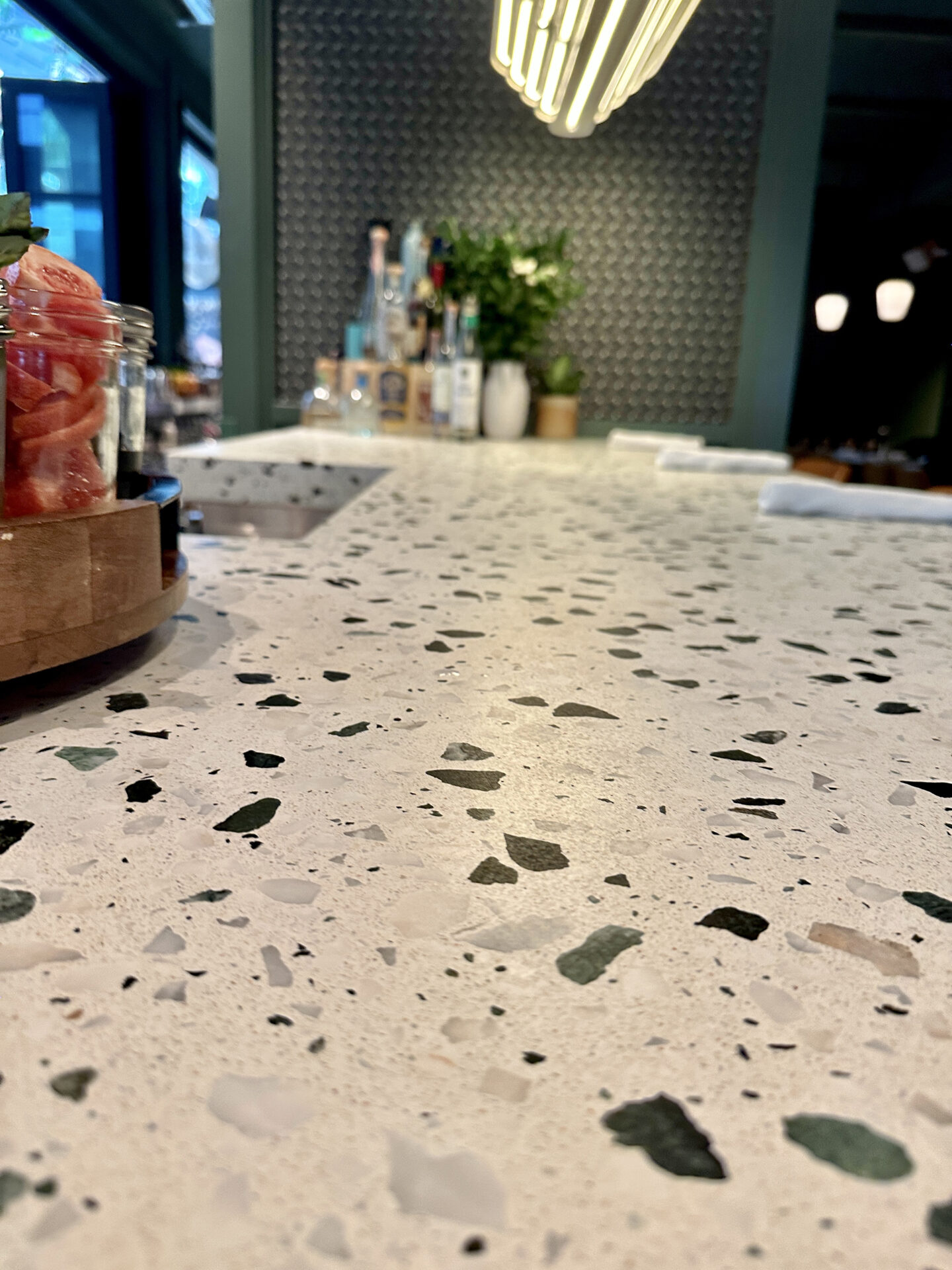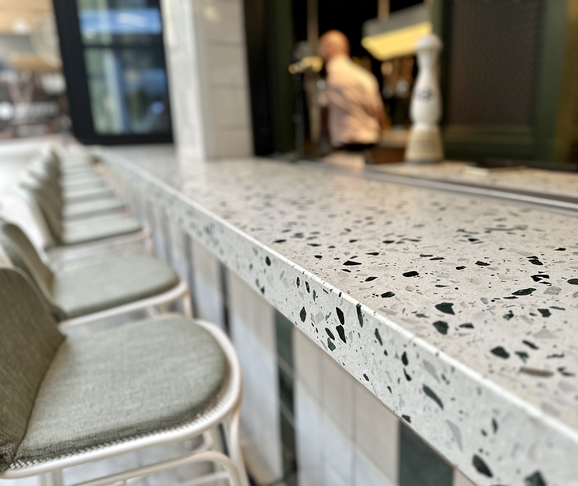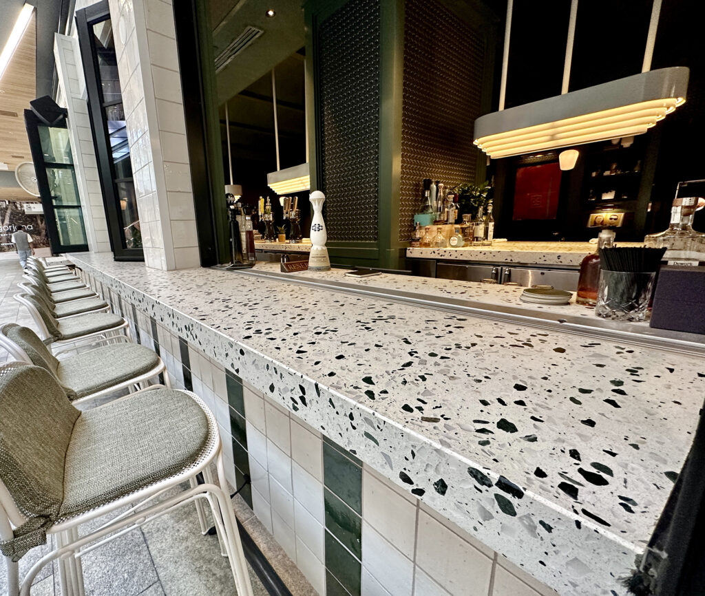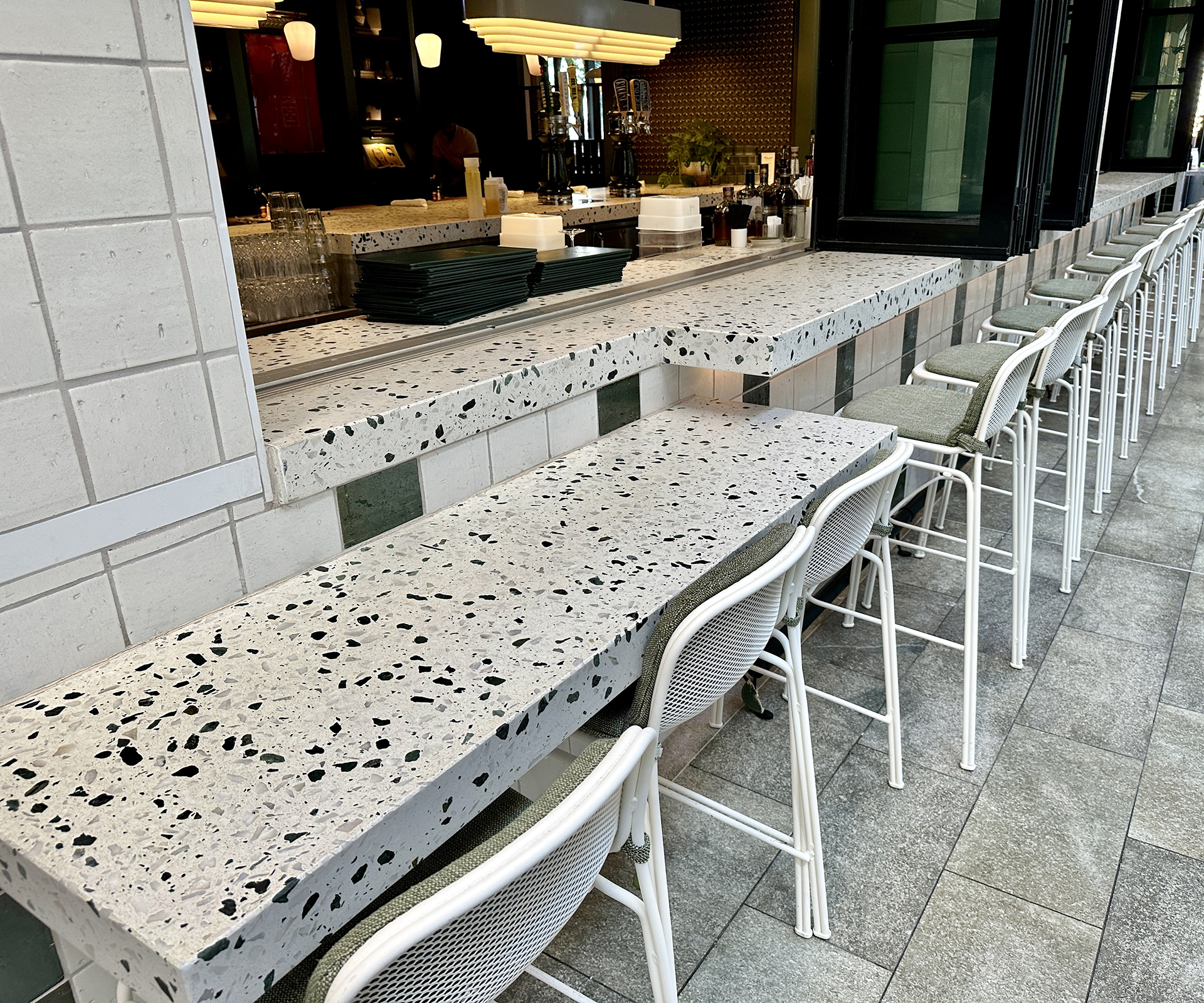 DEX contributed a variety of distinctive high-performance concrete finishes throughout the space, including the main bar top, outdoor bar, coffee bar, and bath countertops. The Camo Venizia terrazzo main bar anchors the lively interior, while the Aspen Venizia terrazzo bath countertops add refined detail in a quieter setting. At the coffee bar, a DEXterity Snow surface provides a crisp, polished contrast.