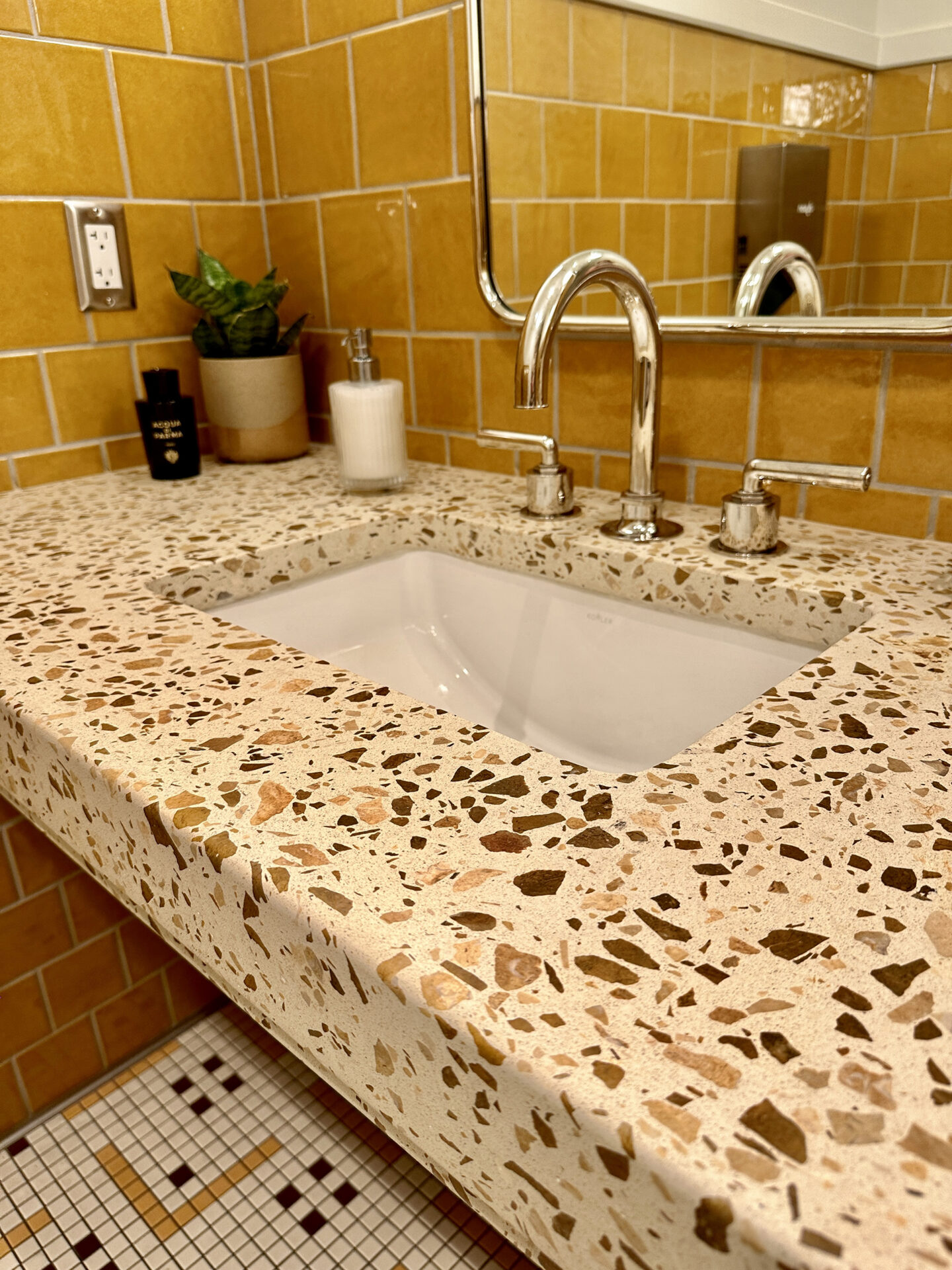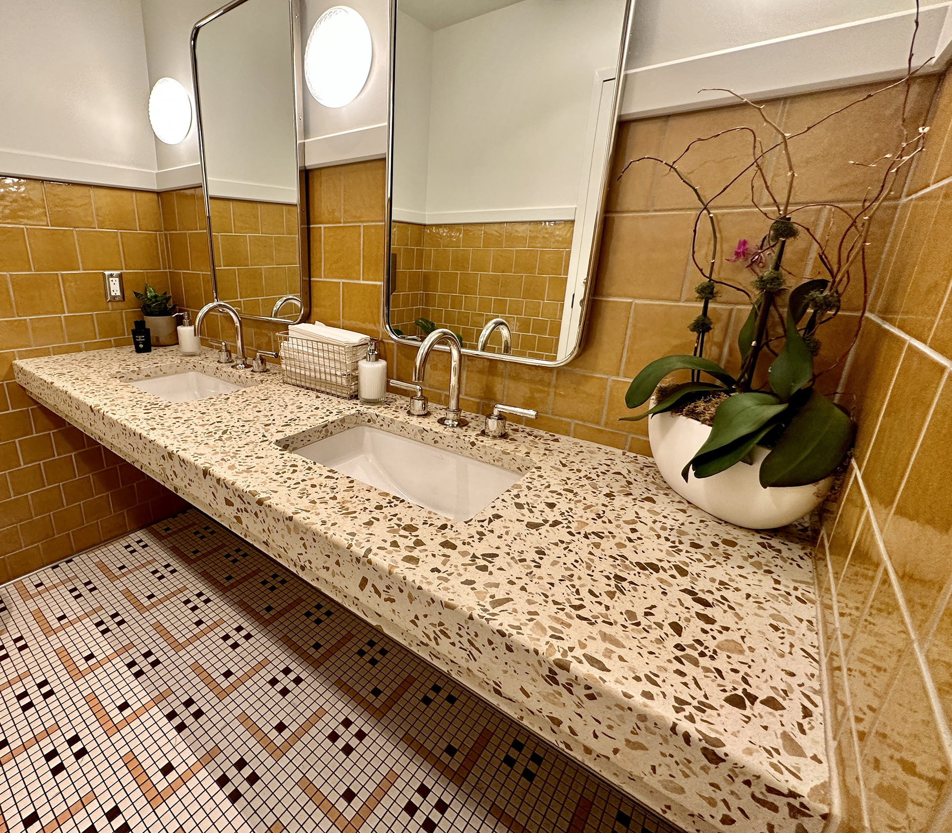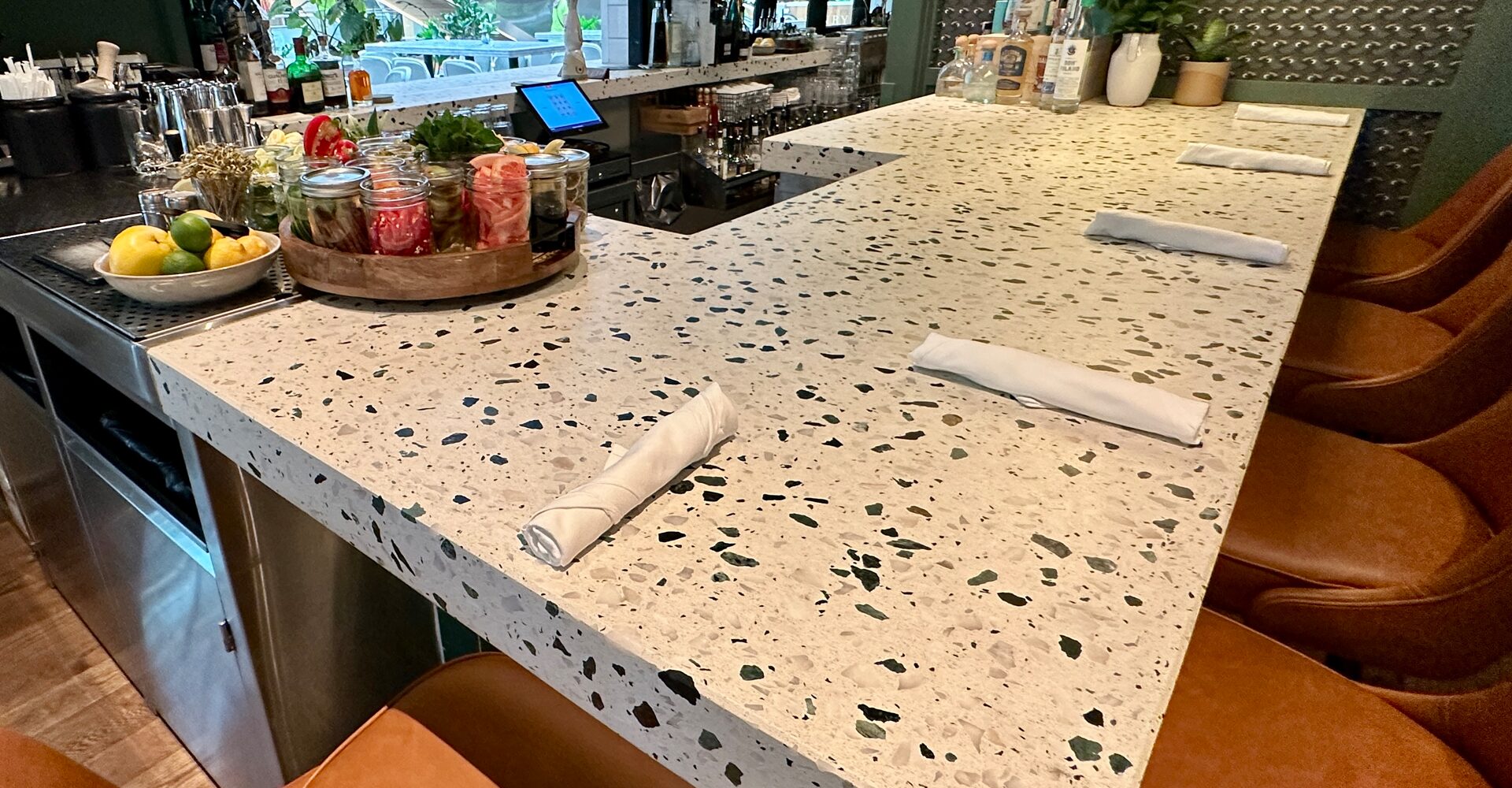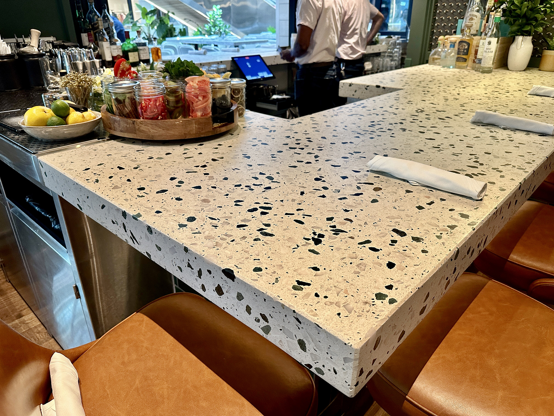 DEX contributed a variety of distinctive high-performance concrete finishes throughout the space, including the main bar top, outdoor bar, coffee bar, and bath countertops. The Camo Venizia terrazzo main bar anchors the lively interior, while the Aspen Venizia terrazzo bath countertops add refined detail in a quieter setting. At the coffee bar, a DEXterity Snow surface provides a crisp, polished contrast.