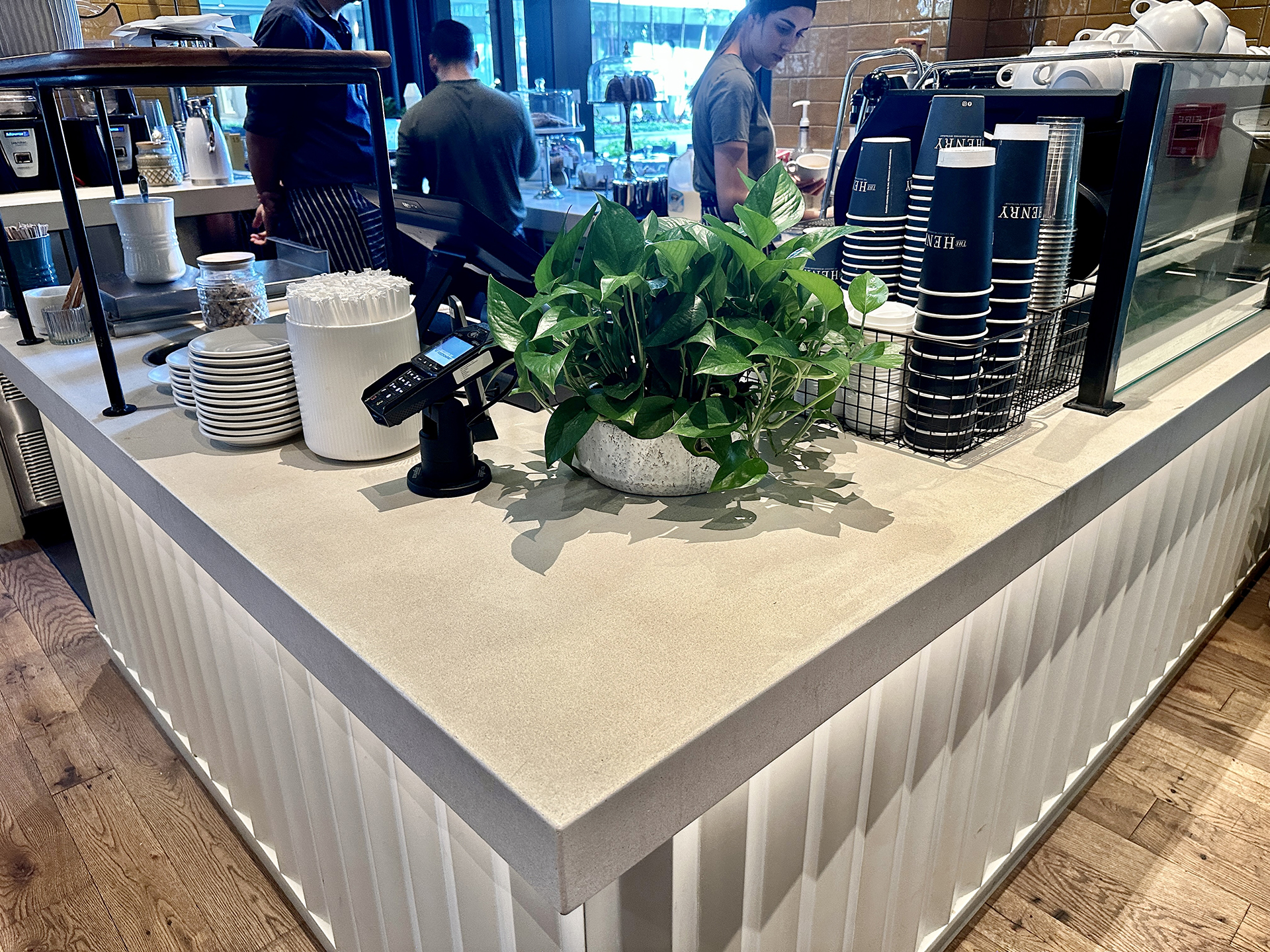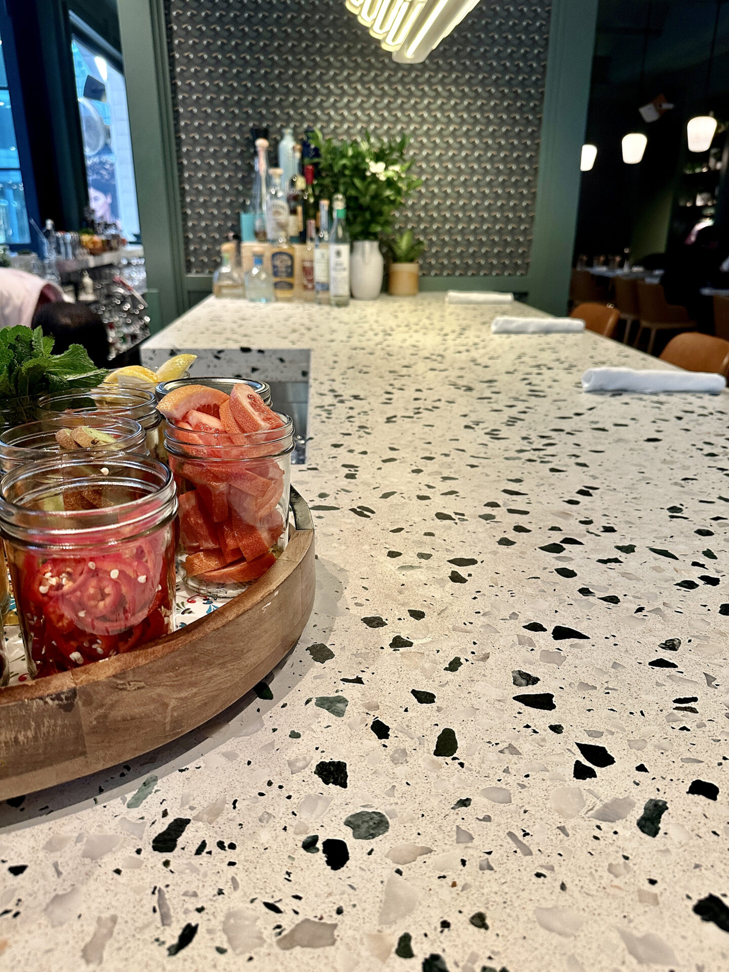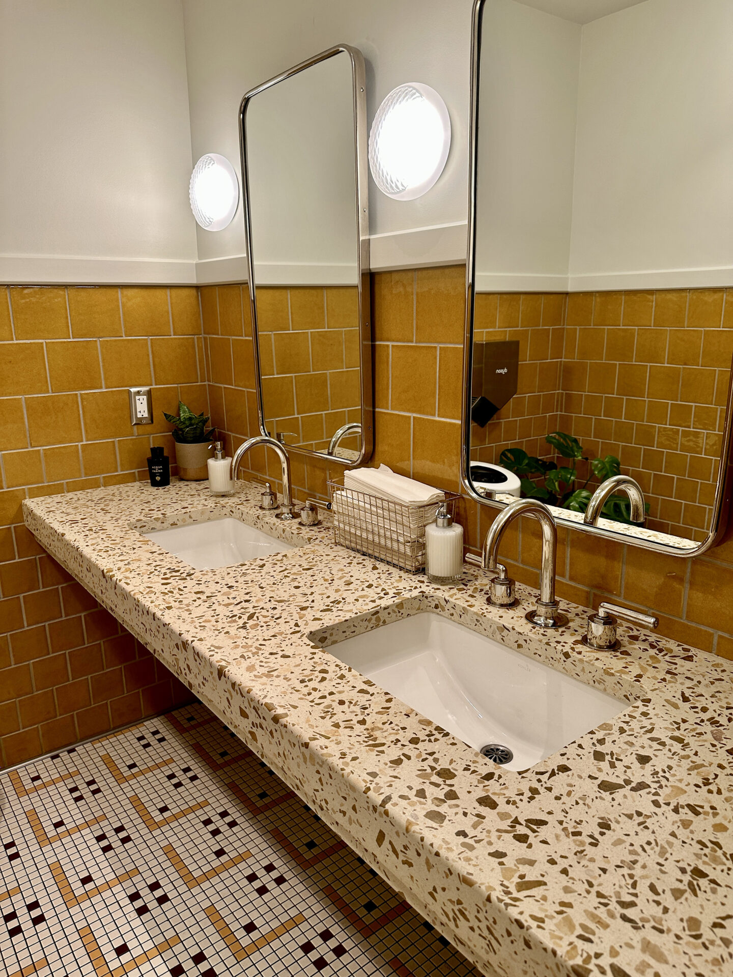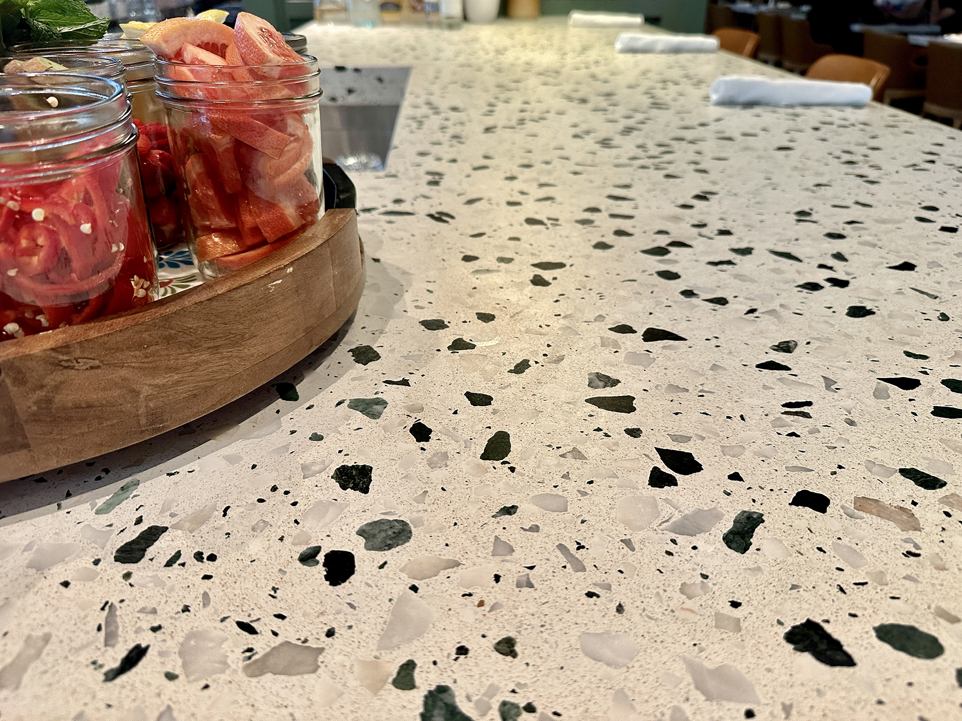 DEX contributed a variety of distinctive high-performance concrete finishes throughout the space, including the main bar top, outdoor bar, coffee bar, and bath countertops. The Camo Venizia terrazzo main bar anchors the lively interior, while the Aspen Venizia terrazzo bath countertops add refined detail in a quieter setting. At the coffee bar, a DEXterity Snow surface provides a crisp, polished contrast.