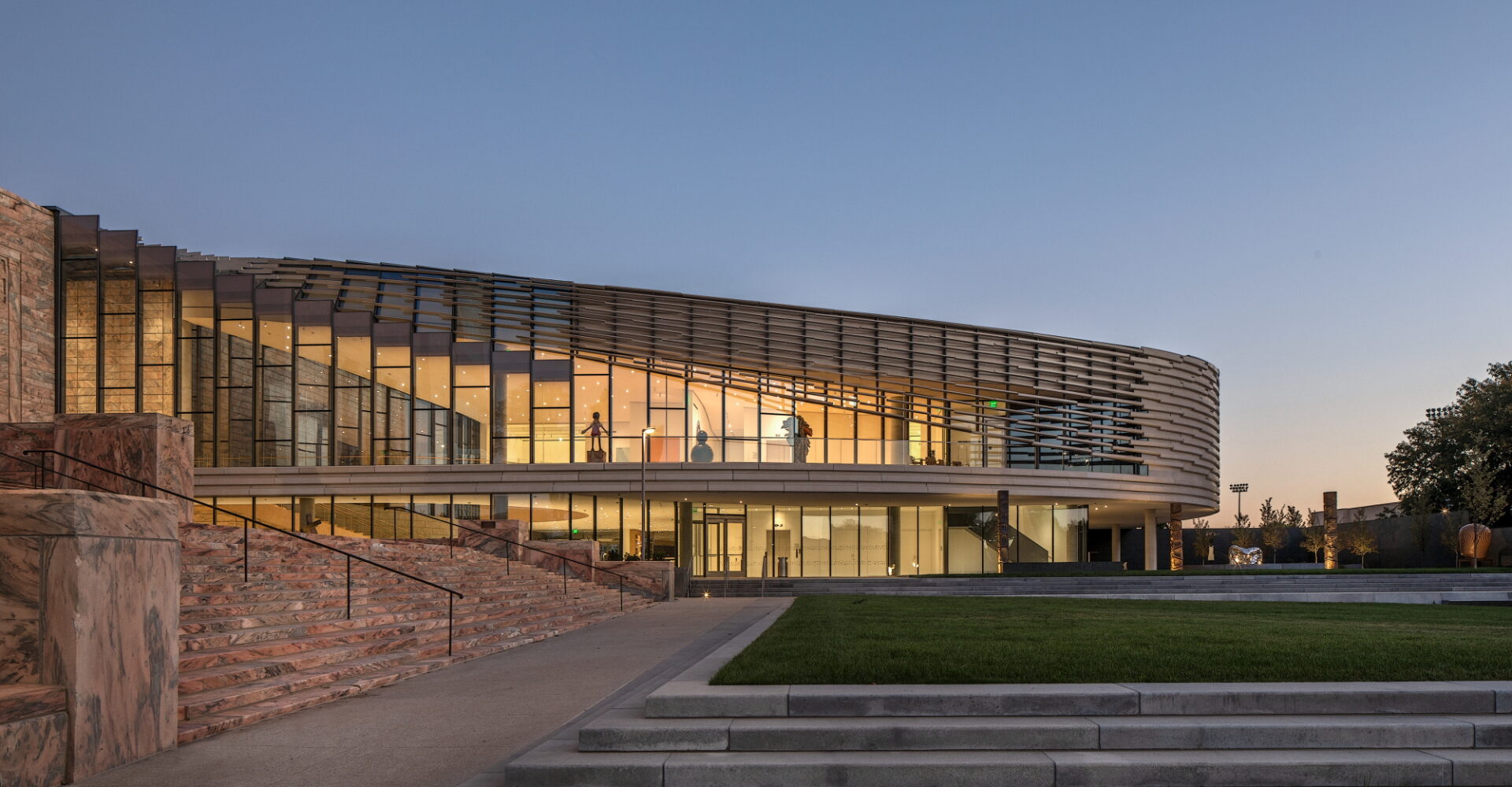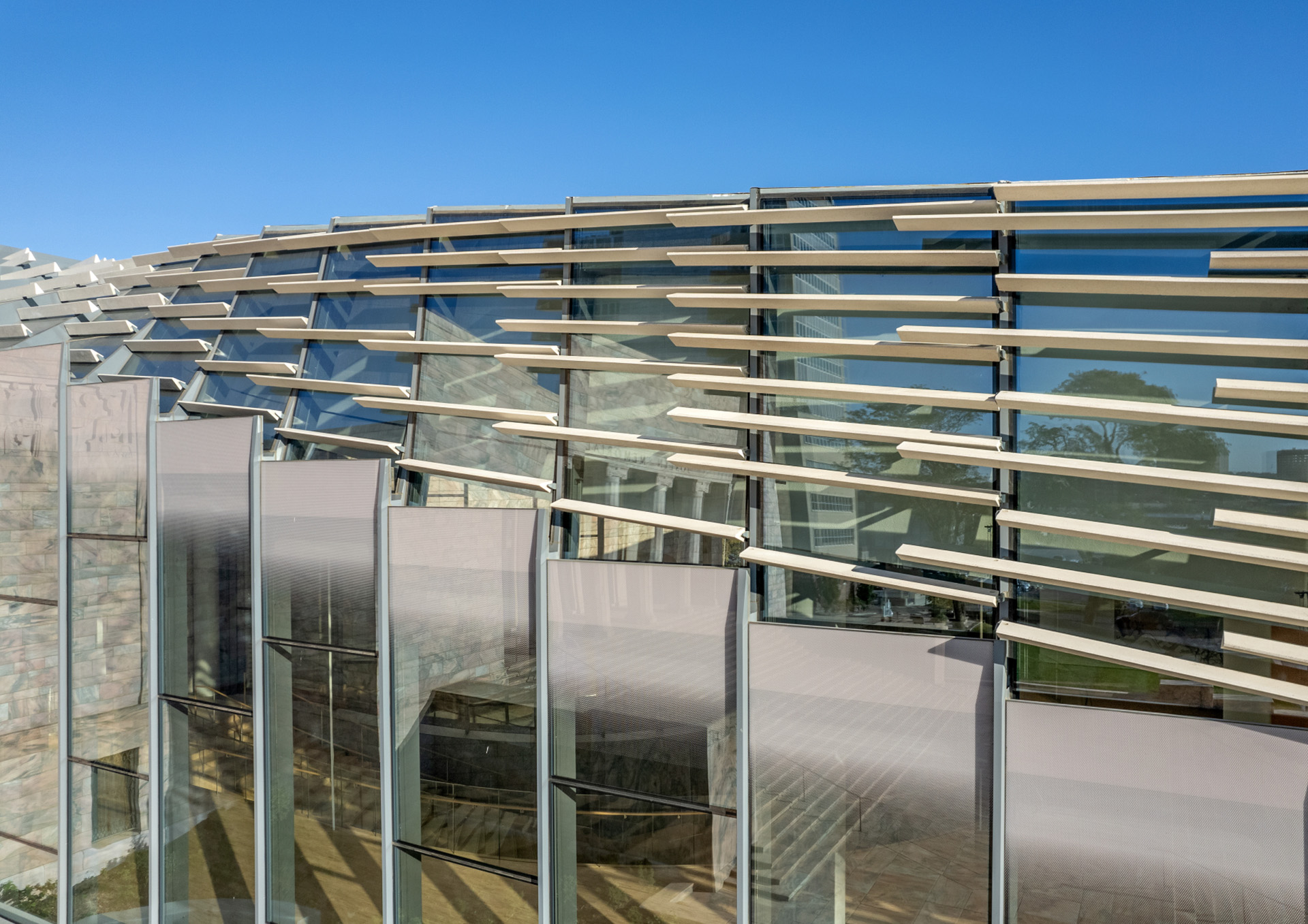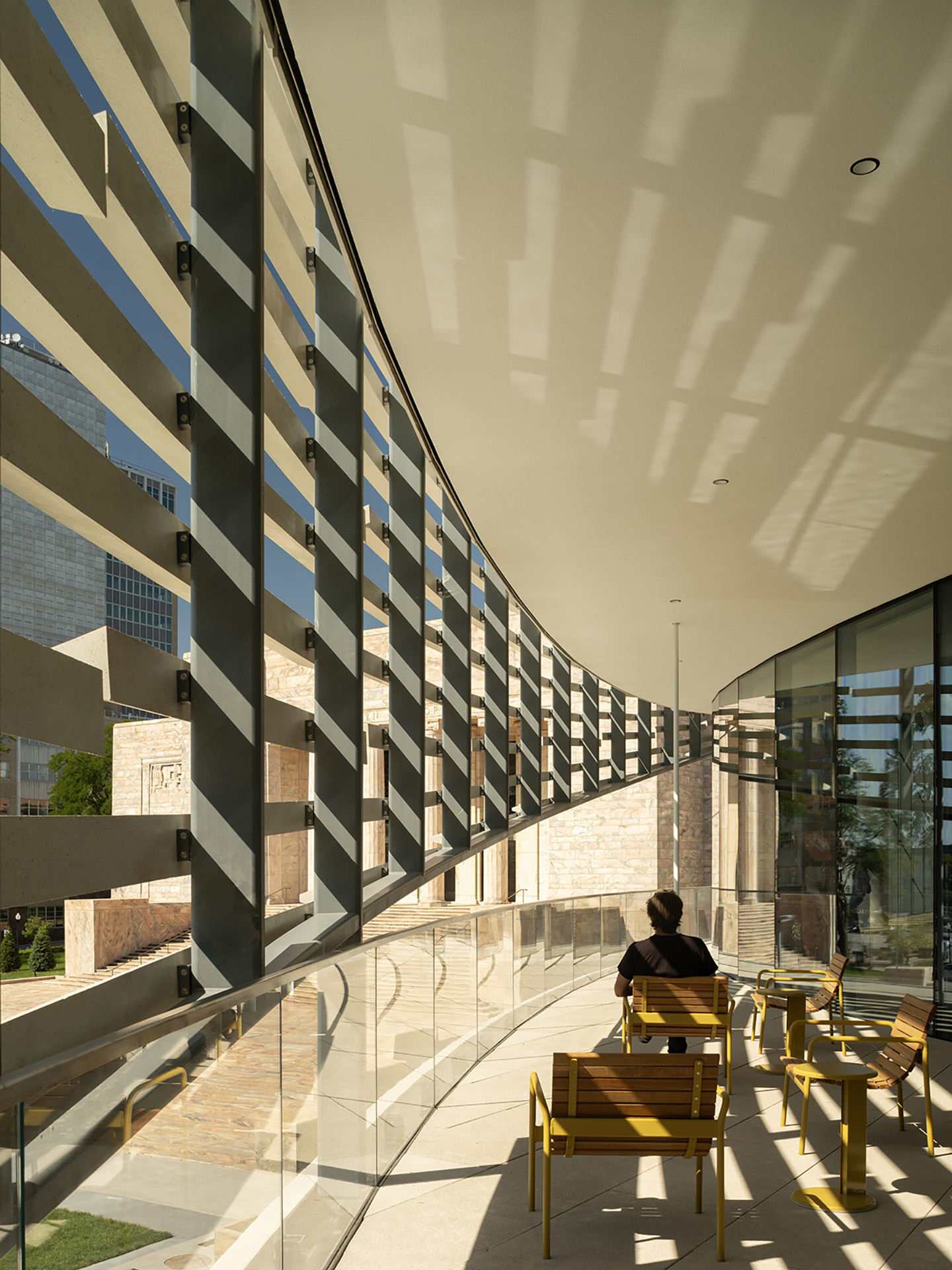 The horizontal panels introduce texture and thoughtfully reflect the stacked stone steps of the Joslyn Memorial building. With their generous overhangs, these elements create inviting outdoor spaces and guide visitors toward the museum’s new entrance. The curved design allows natural light to fill the pavilion’s interior, fostering a harmonious connection between the new addition and the existing museum spaces.