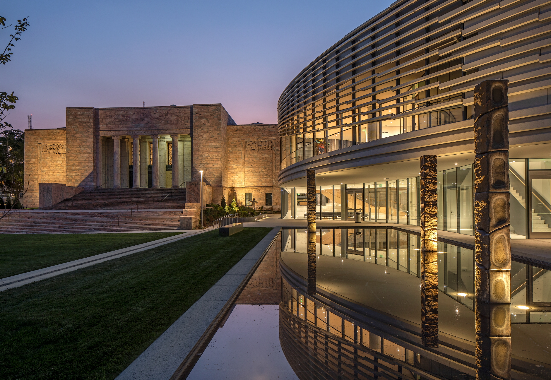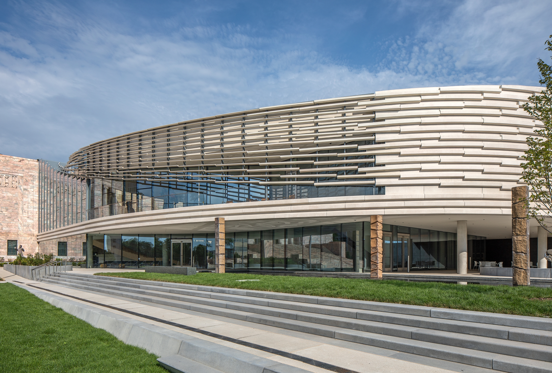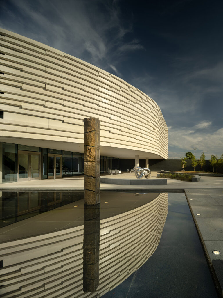 The horizontal panels introduce texture and thoughtfully reflect the stacked stone steps of the Joslyn Memorial building. With their generous overhangs, these elements create inviting outdoor spaces and guide visitors toward the museum’s new entrance. The curved design allows natural light to fill the pavilion’s interior, fostering a harmonious connection between the new addition and the existing museum spaces.