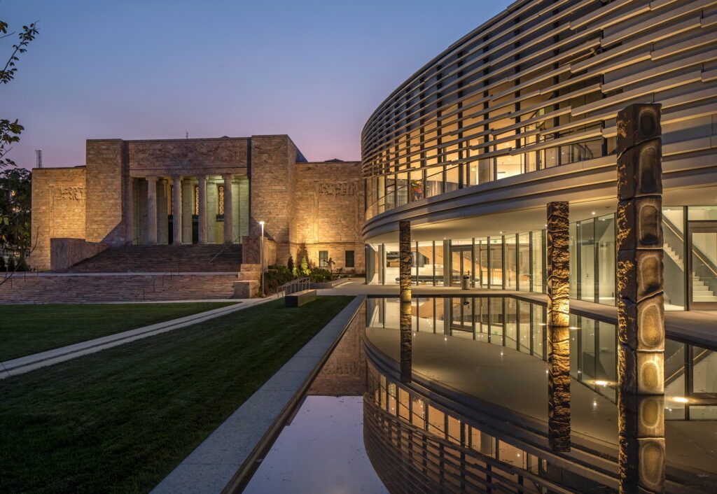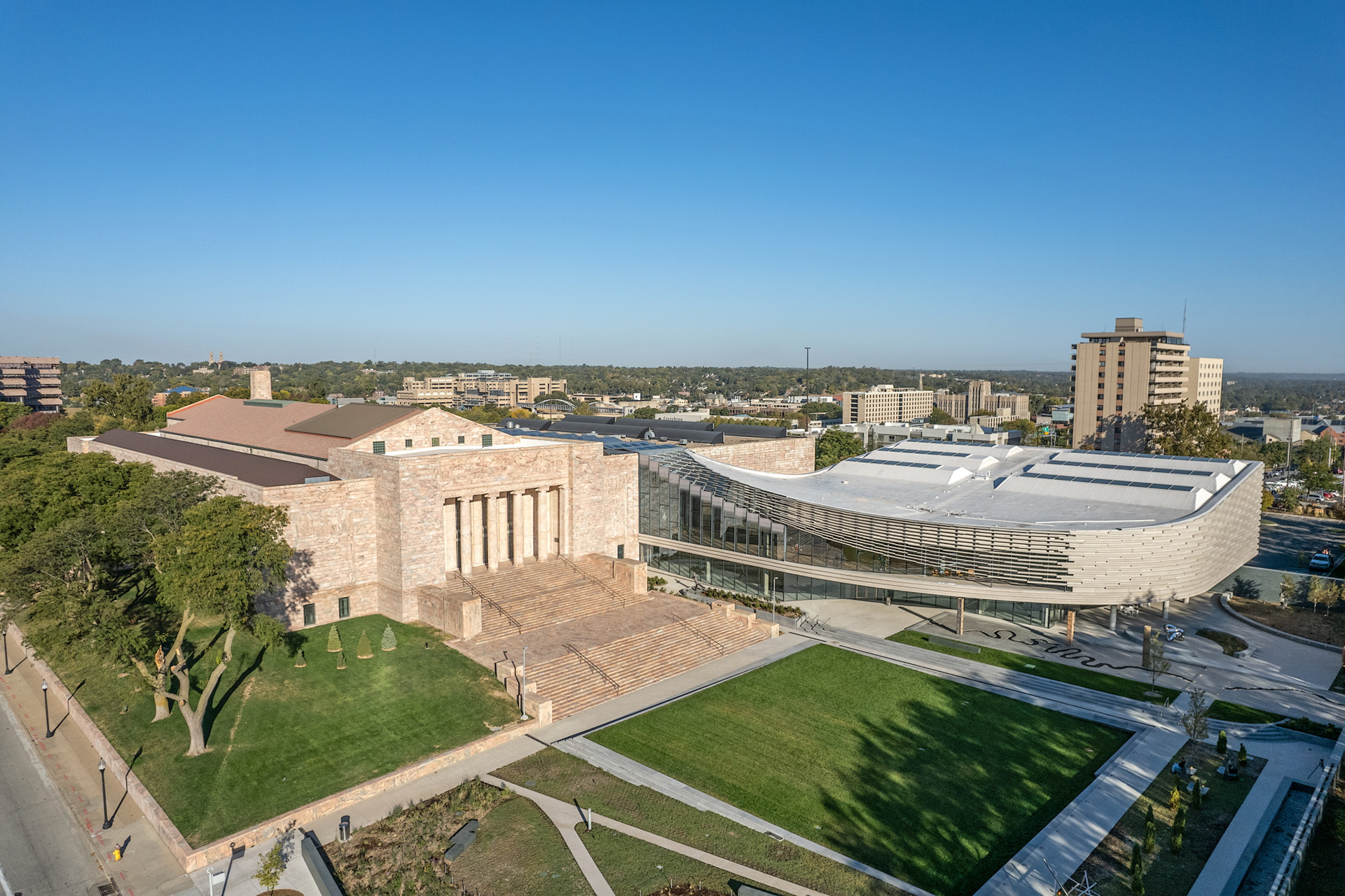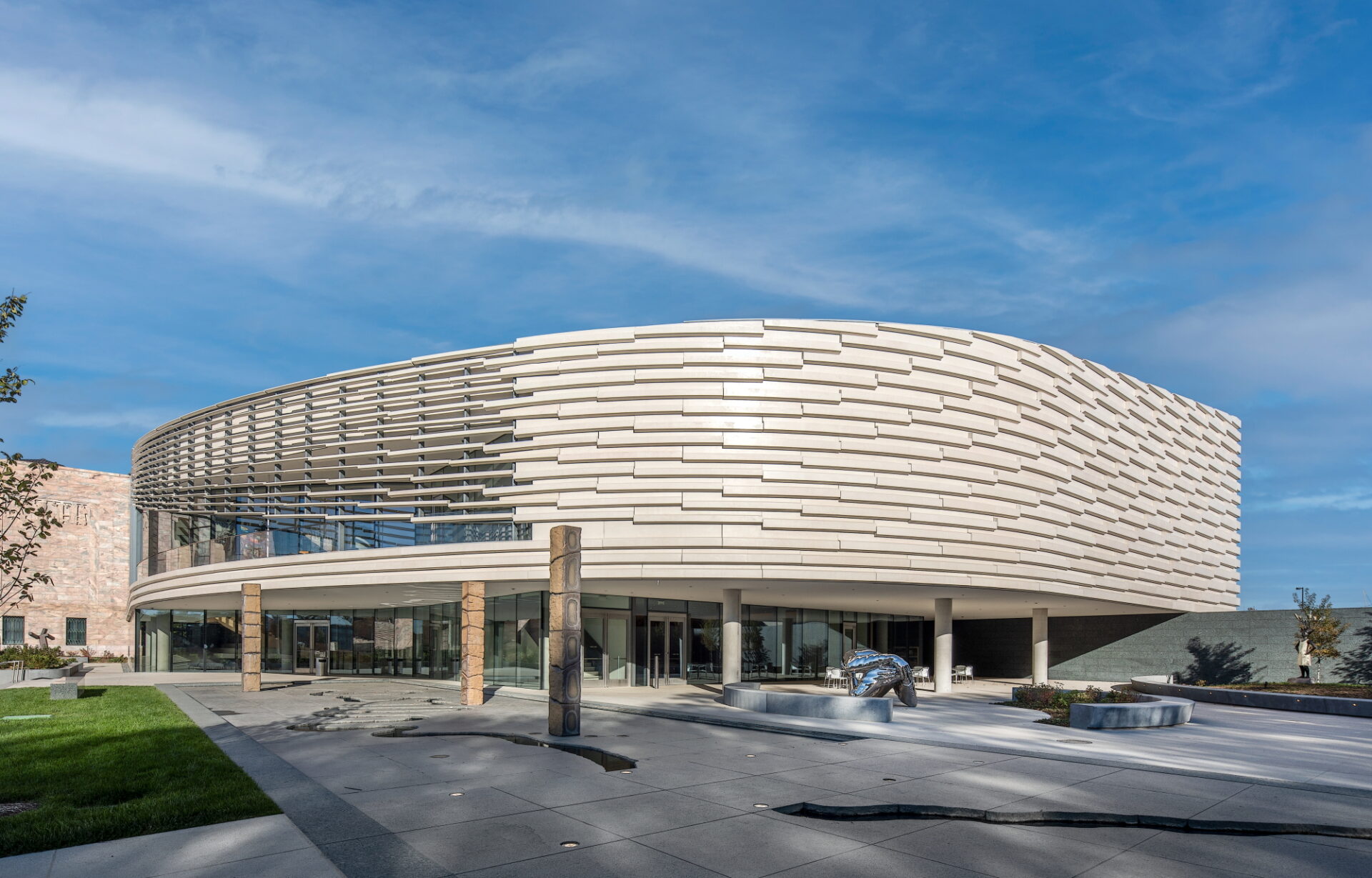 Designed with inspiration drawn from Nebraska’s diverse landscape and weather, the pavilion symbolizes transition through its three interconnected buildings, each showcasing different architectural styles. The versatility of precast concrete plays a pivotal role in this seamless fusion. The Hawks Pavilion appears to float gracefully between the existing museum structures, its curvilinear shape creating a gentle contrast to the angular forms of its neighbors. The design evokes the sky and cloud patterns found over the Great Plains, while the deep overhangs and horizontal elements pay homage to Prairie School architecture.