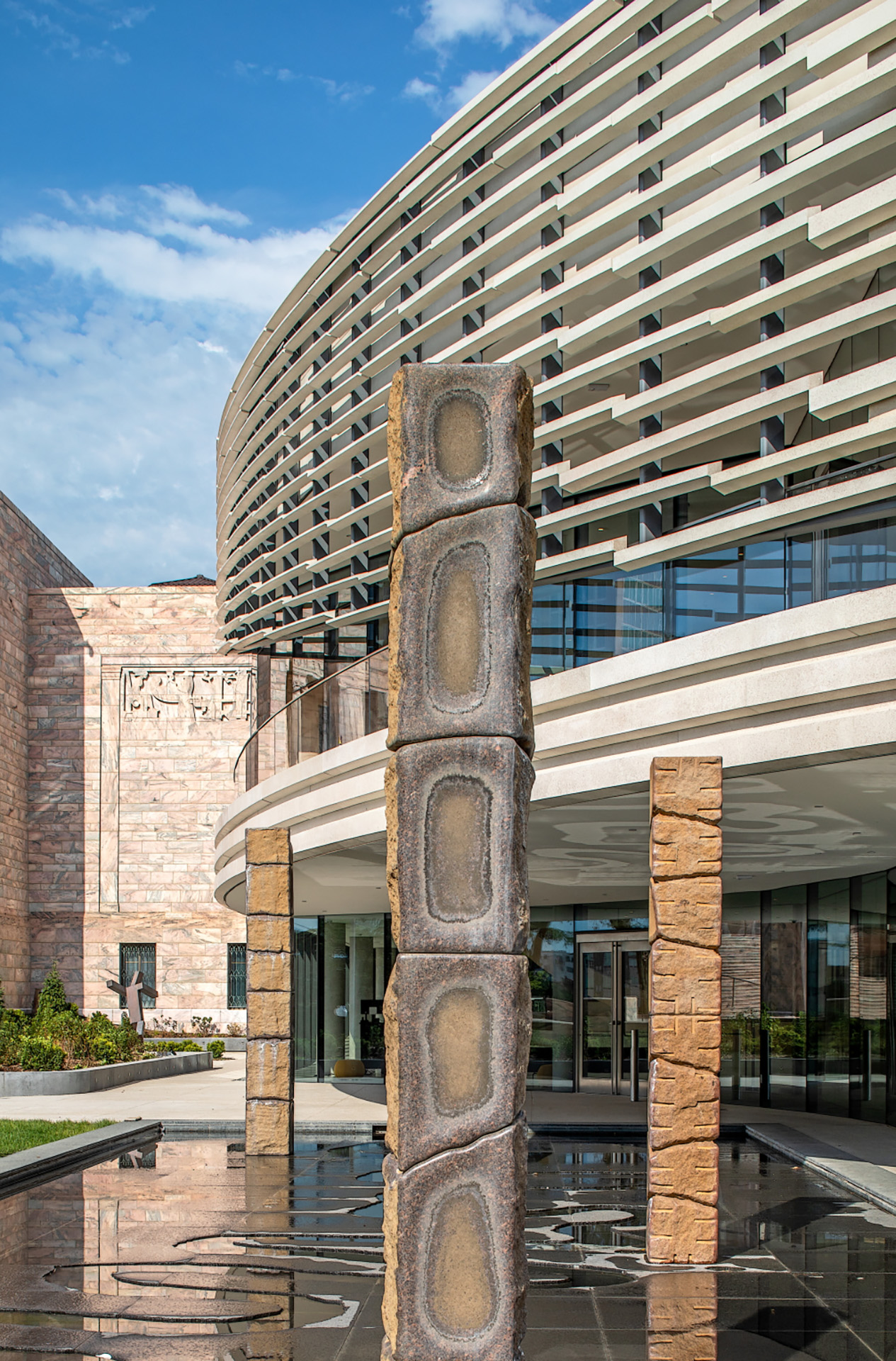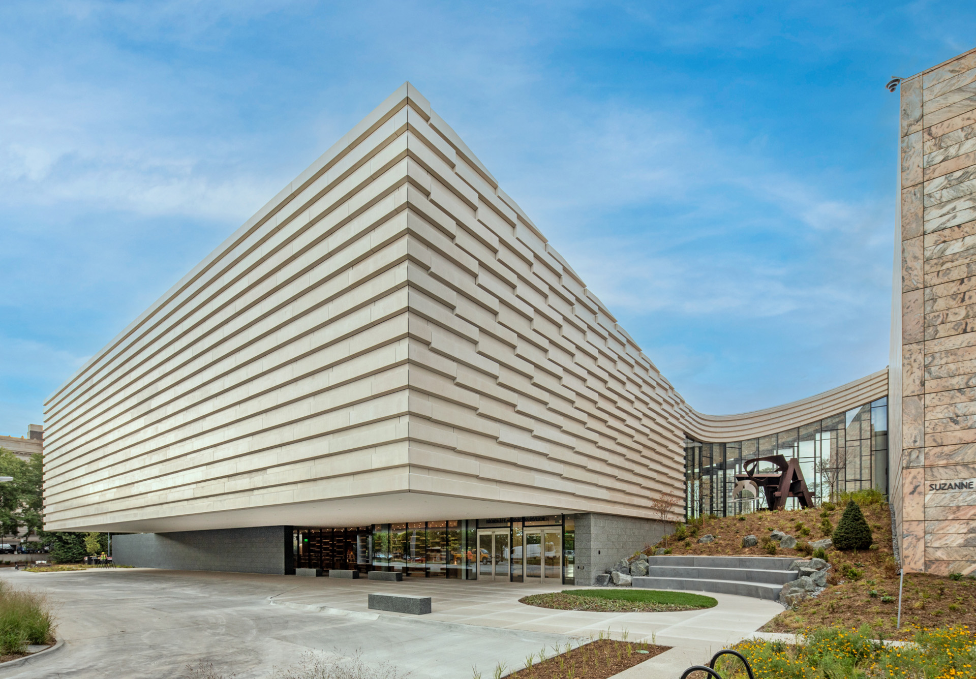The Rhonda & Howard Hawks Pavilion is a stunning new addition to the Joslyn Art Museum, spanning 42,000 square feet and expanding gallery space by 40%. This pavilion is not just a physical expansion; it also enhances Joslyn’s reputation as a historic landmark and a thriving cultural center. Its exterior features polished, high-performance concrete panels with vibrant pink Rosetta aggregate, allowing it to harmoniously blend with the striking Etowah Fleuri (Georgia Pink) marble of both the 1931 Art Deco Joslyn Memorial building and the 1994 Scott Pavilion.