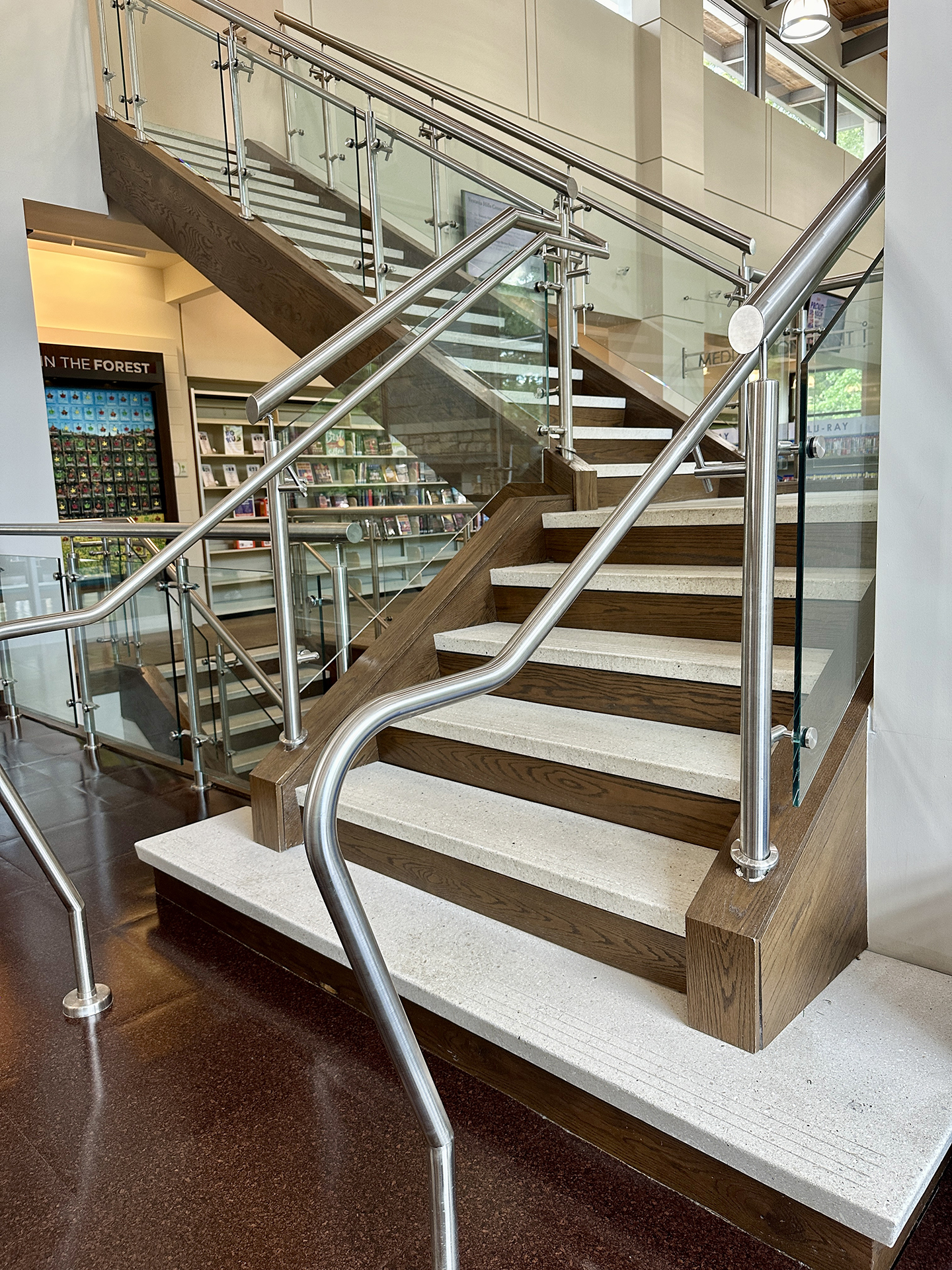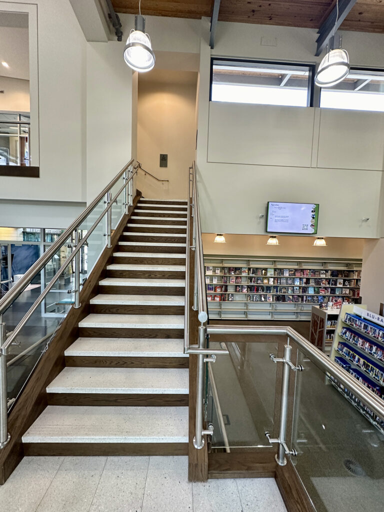 • A monumental staircase with flat treads and integral non-slip grooves for safety and accessibility