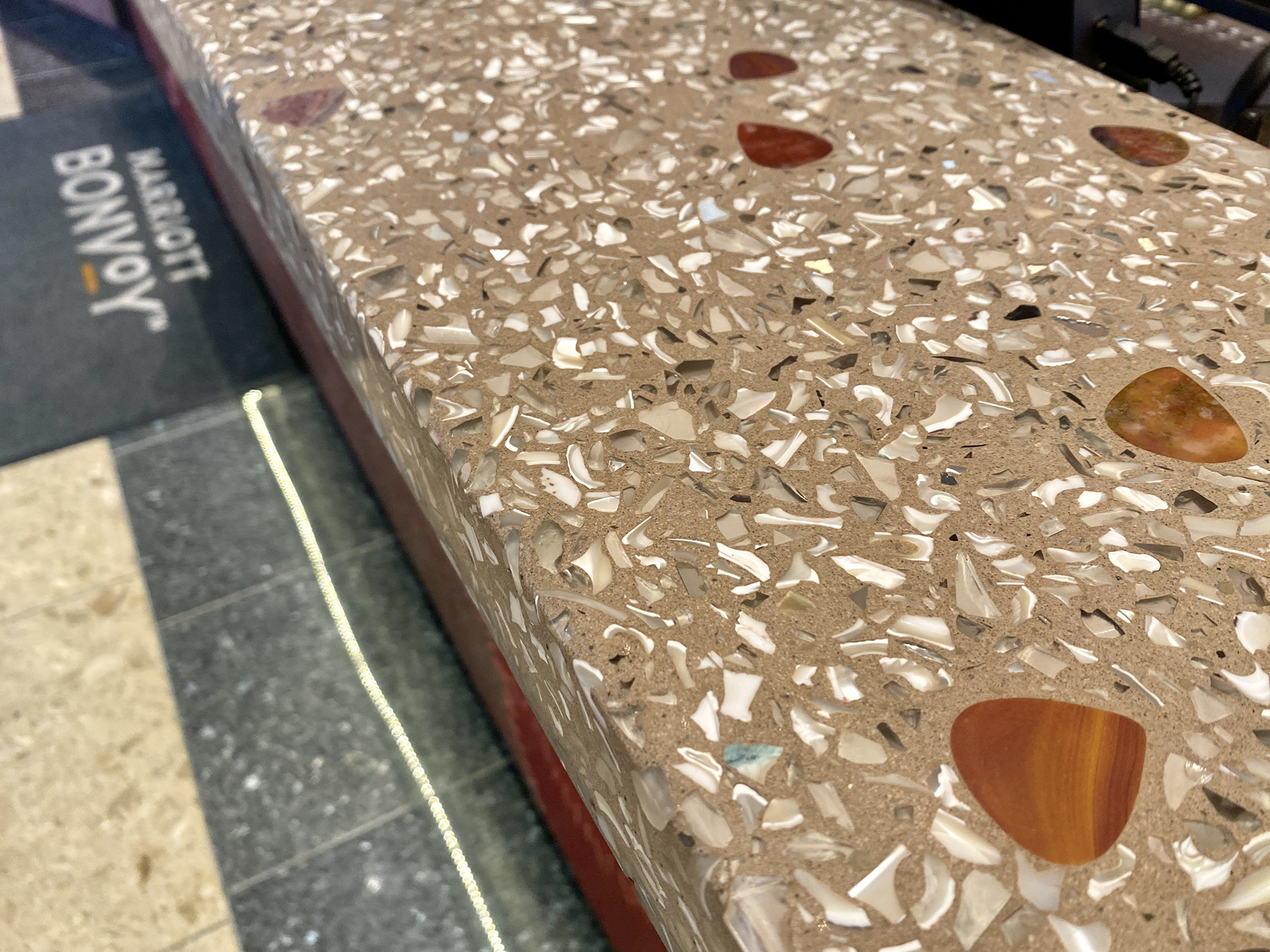 At the Westin Nashville, music and design converge in a striking reception desk crafted by DEX. Made in a custom DEXterra terrazzo mix, the desk incorporates recycled glass and 200 hand-selected red stone agate guitar pick inlays, each polished to a high gloss. This bespoke detail nods to Nashville’s iconic music heritage while anchoring the hotel’s modern, design-forward interiors.
